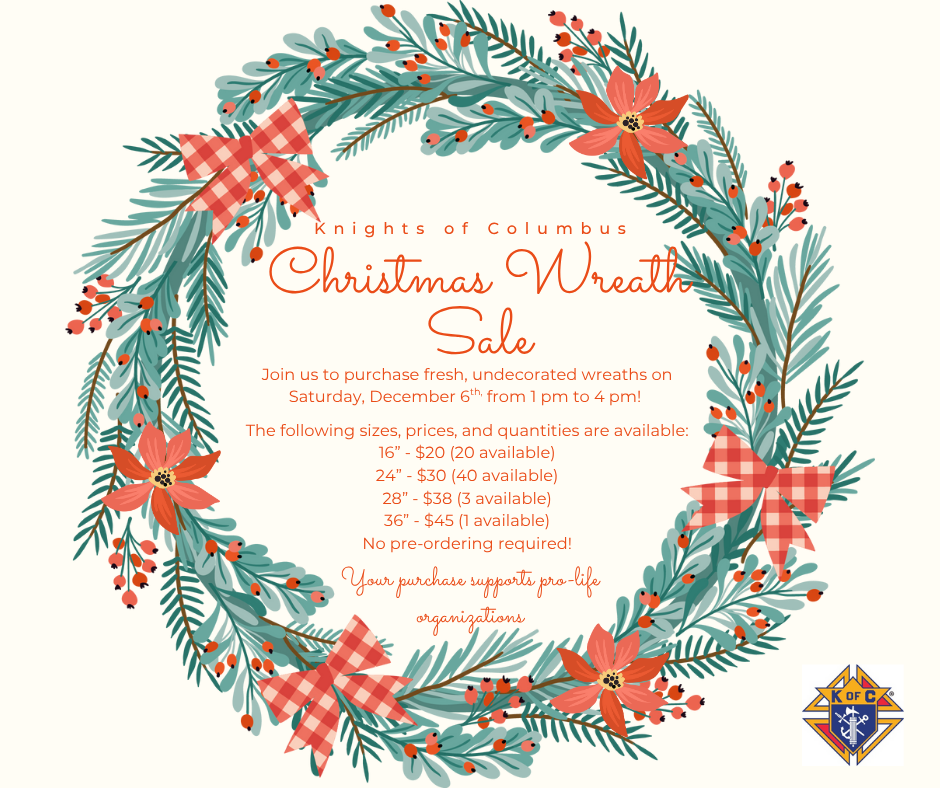 « All Events KOC Christmas Wreath Sale December 6 @ 1:00 pm - 4:00 pm « When Faith Costs Everything: Lessons from The Persecuted: A Presentation by Casey Chalk Advent Family Movie Night » + Google Calendar+ iCal Export Details Date: December 6 Time: 1:00 pm - 4:00 pm Organizer Knights of Columbus