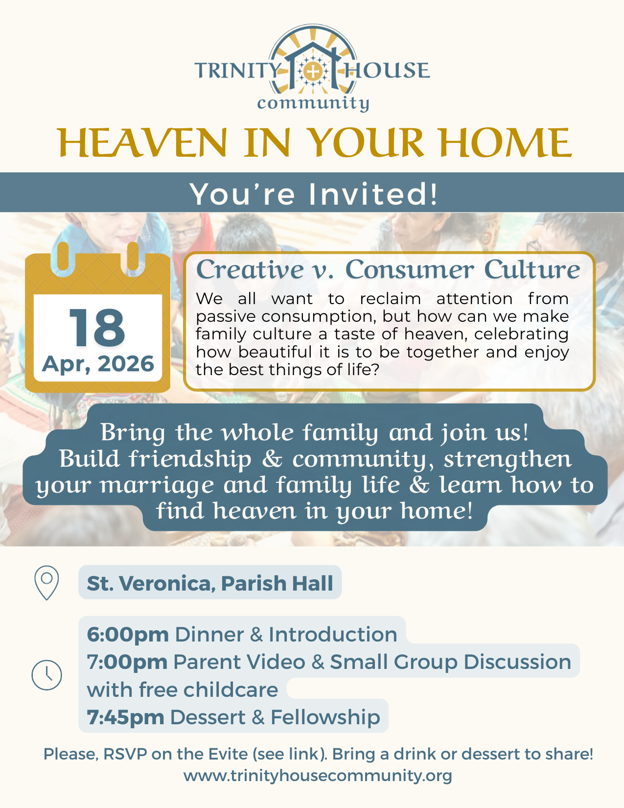 All families are invited to the Trinity House Community event on April 18th at 6pm in the Parish Hall. Dinner will be provided with free childcare while adults discuss this session’s topic: CREATIVE VS CONSUMER CULTURE.