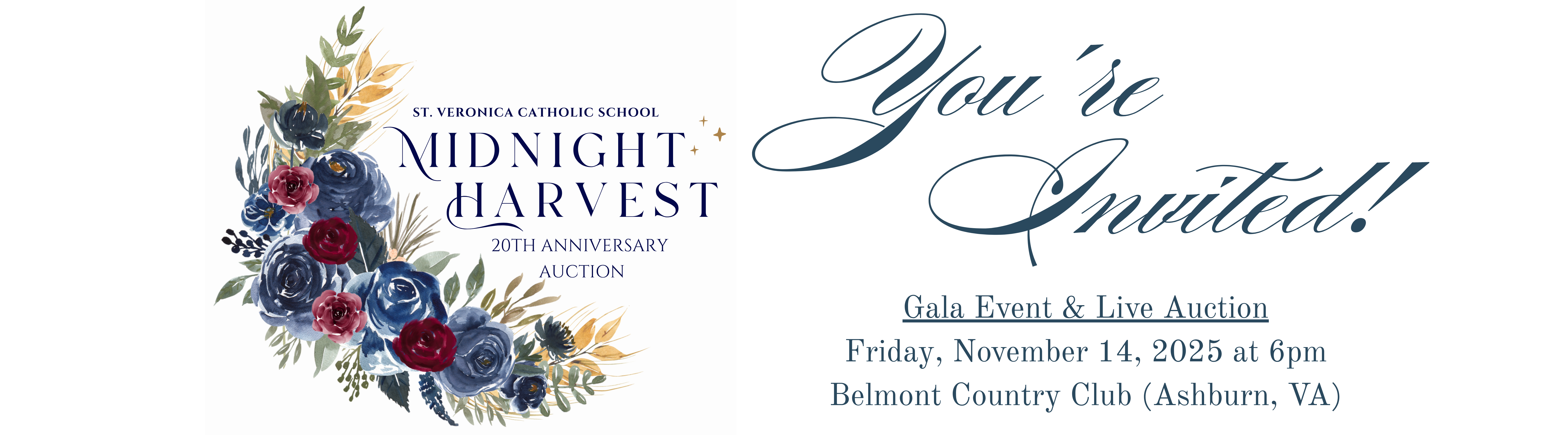St. Veronica Catholic School invites you to the 20th Anniversary Gala & Auction! The Midnight Harvest Event will be held on Friday, November 14, 2025 from 6pm to 11pm at Belmont Country Club (Ashburn, VA).