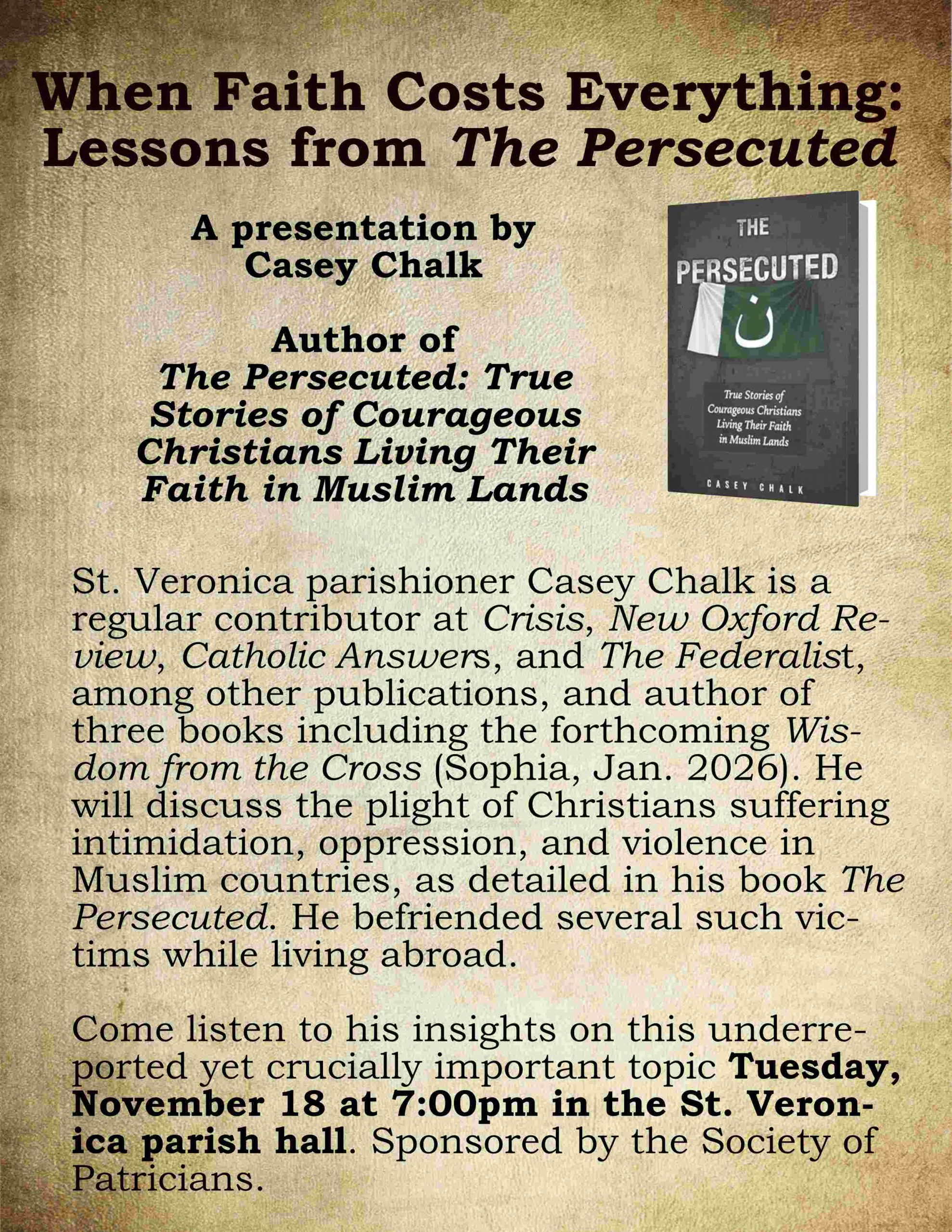 St. Veronica parishioner, Casey Chalk, is a regular contributor at Crisis, New Oxford Review, Catholic Answers, and The Federalist, among other publications, and author of three books, including the forthcoming Wisdom from the Cross. He will discuss the plight of Christians suffering intimidation, oppression, and violence in Muslim countries, as detailed in his book, The Persecuted. He befriended several such victims while living abroad.