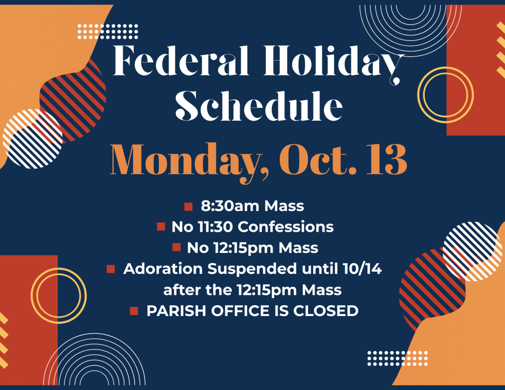 Due to the federal holiday, there will be only one Mass at 8:30am on Monday, October 13, 2025. There will be NO confessions or 12:15pm Mass. Adoration is suspended. The parish office will be closed.